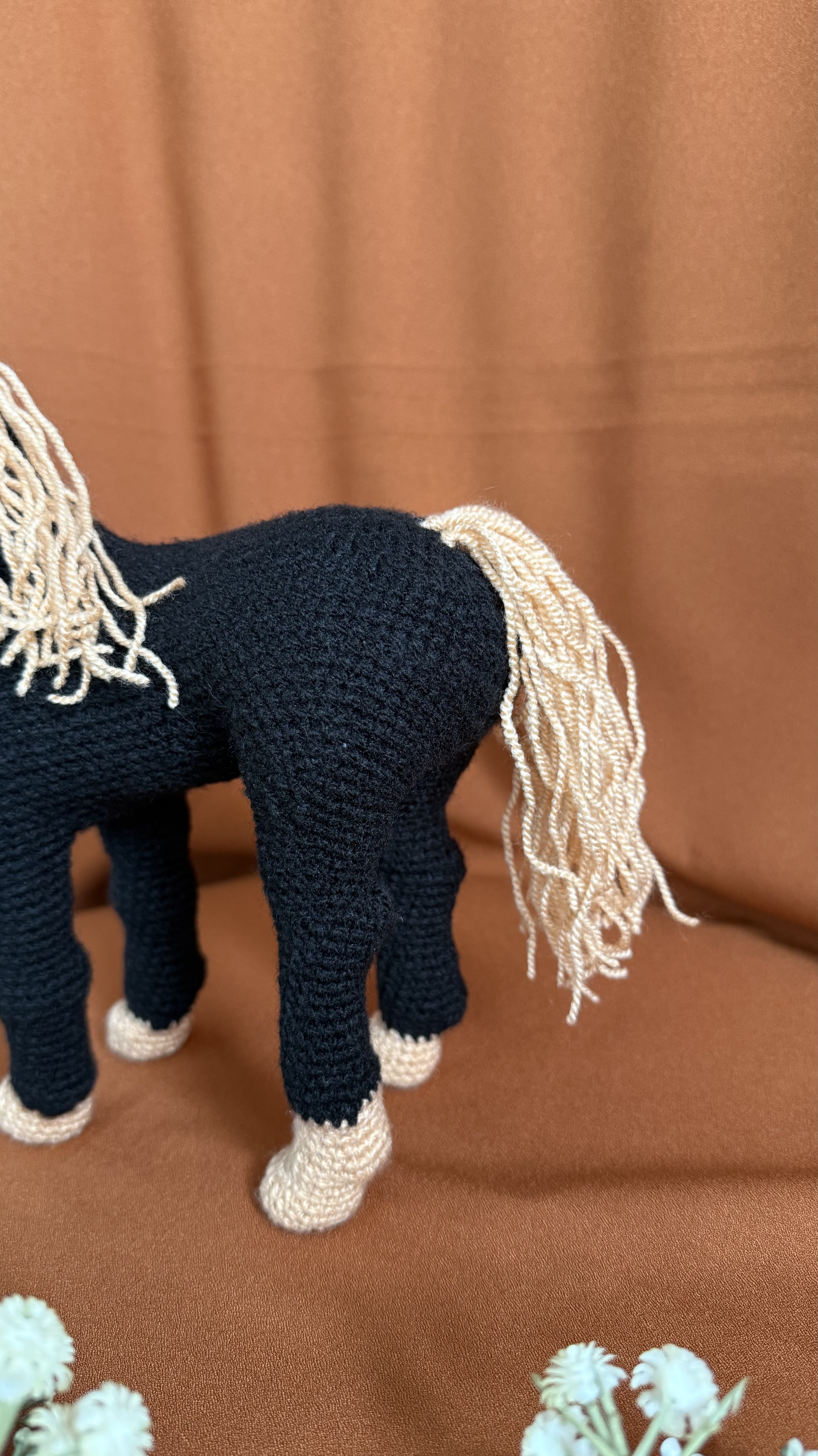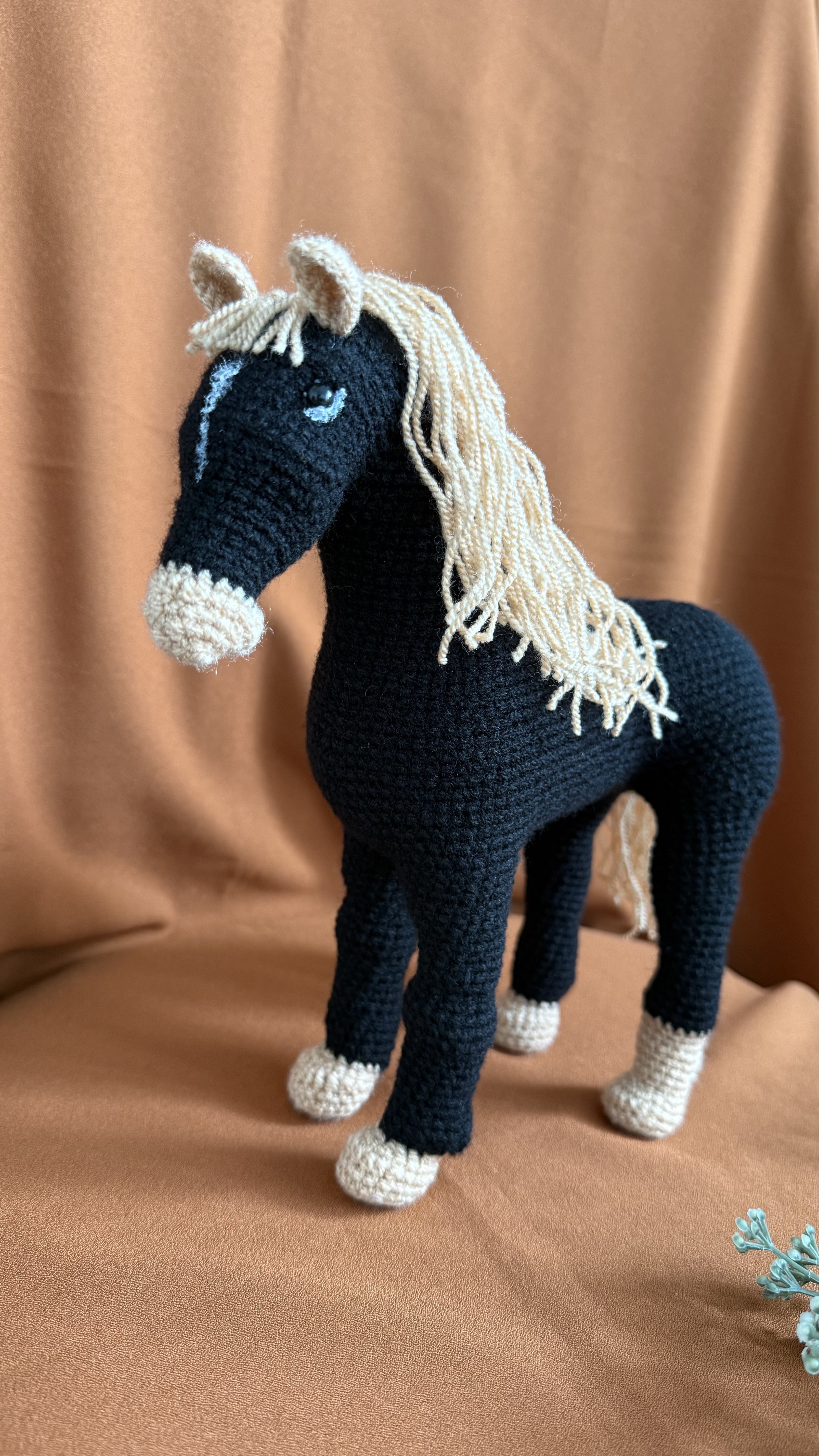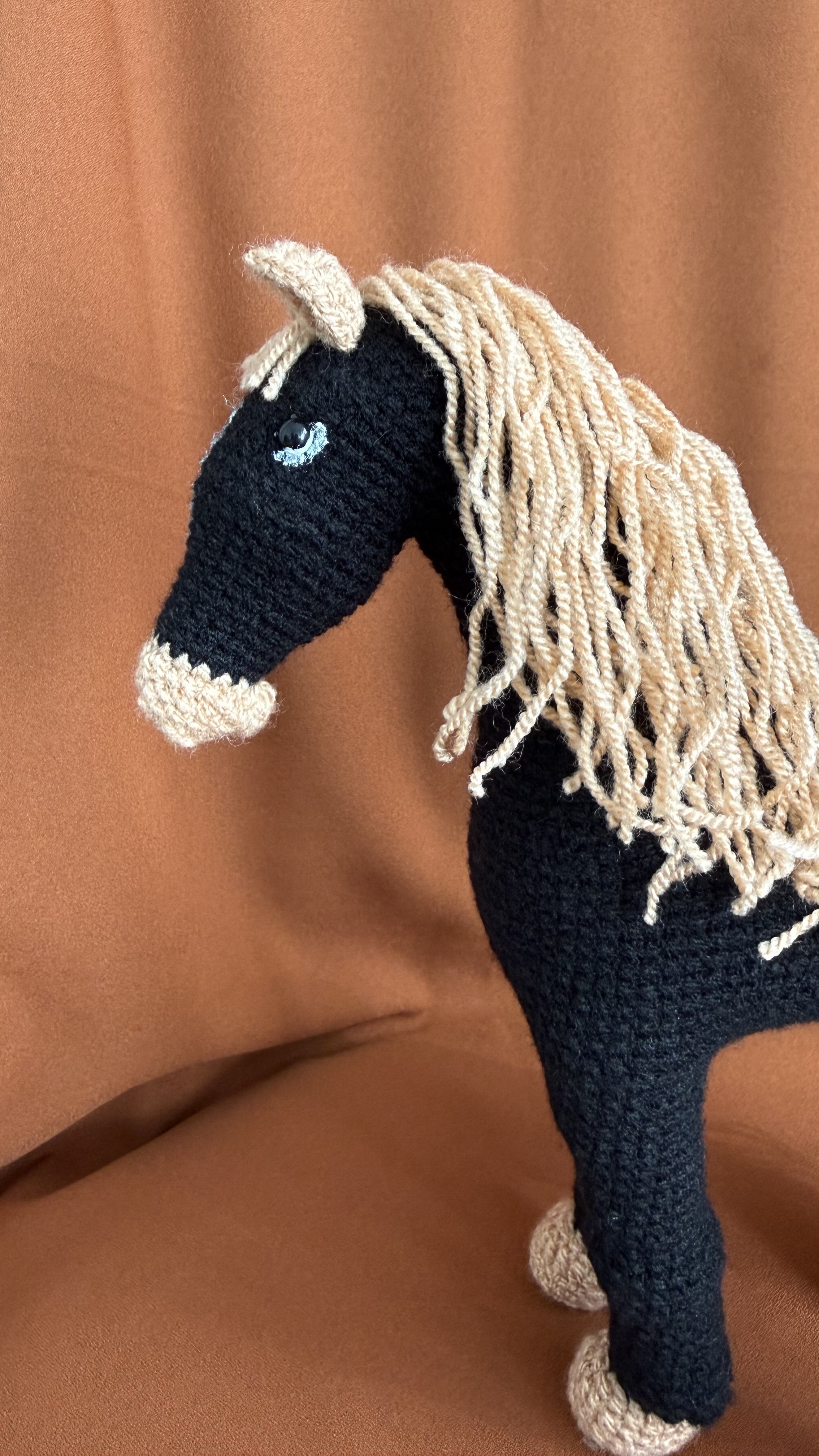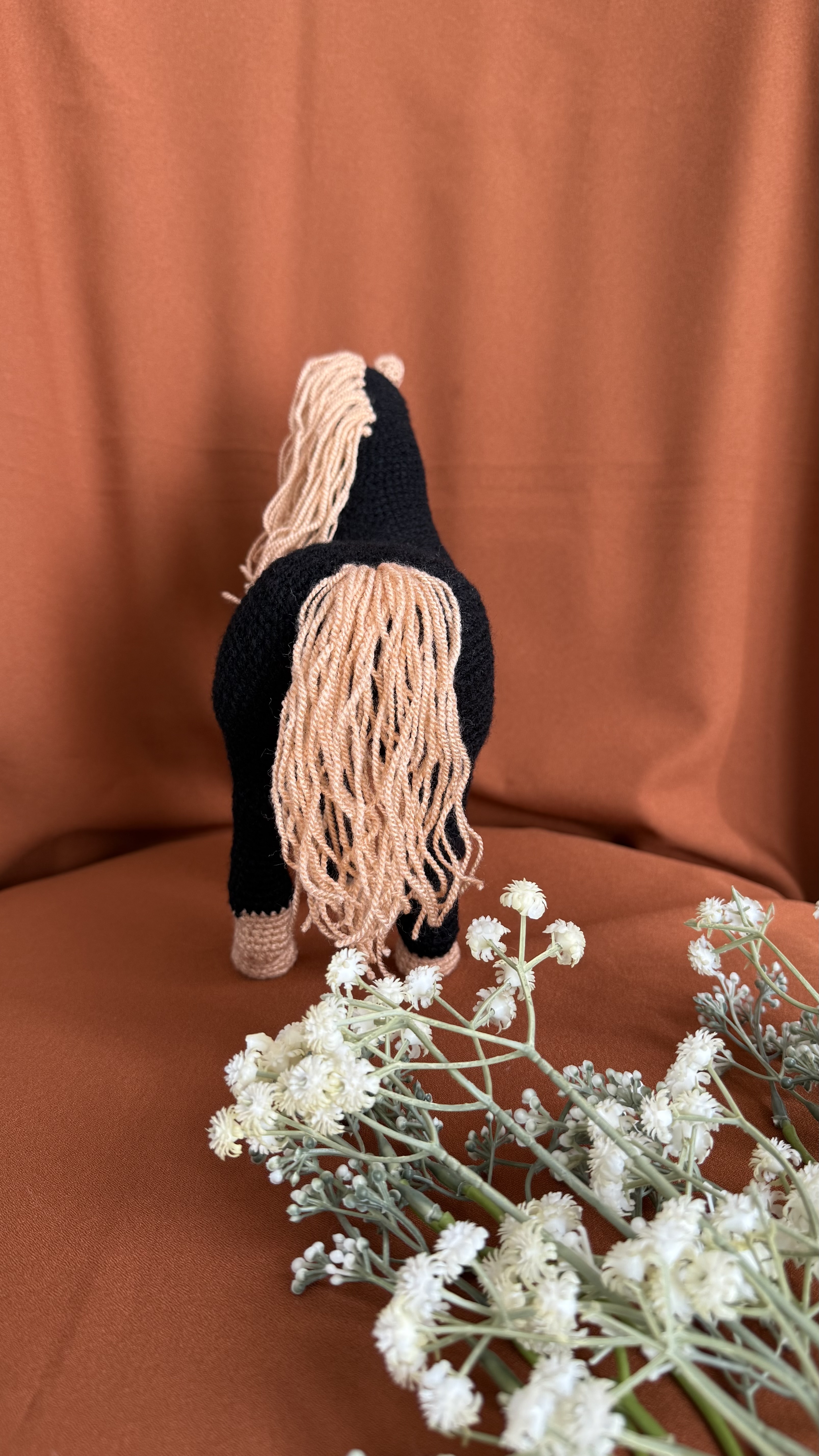 عروسک بافتنی اسب وحشی سیاه مو طلایی یکی از جدید ترین عروسک های بافتنی تیم وانیا می باشد که در آن از تکنیک رنگامیزی نیز استفاده شده است .