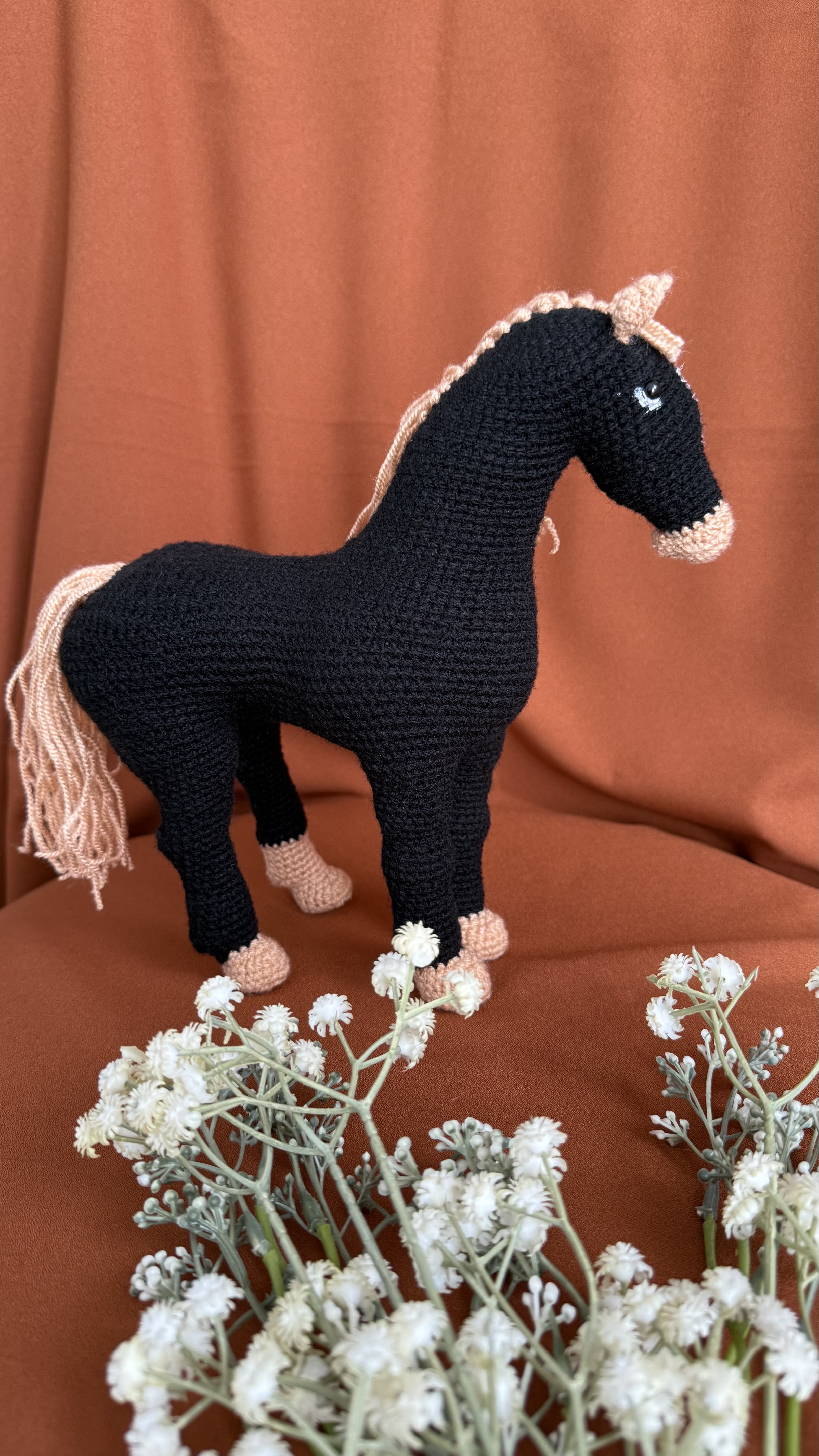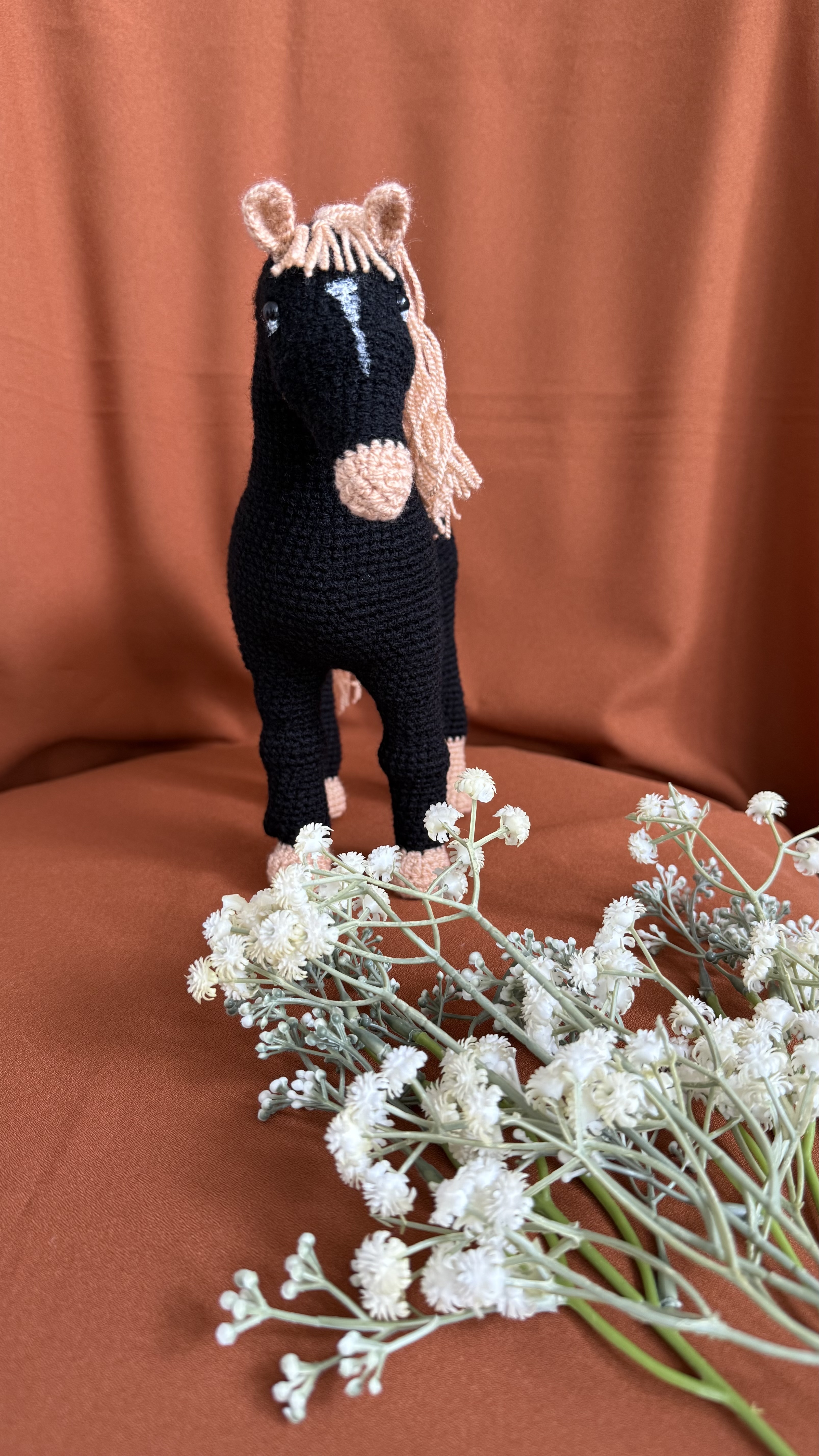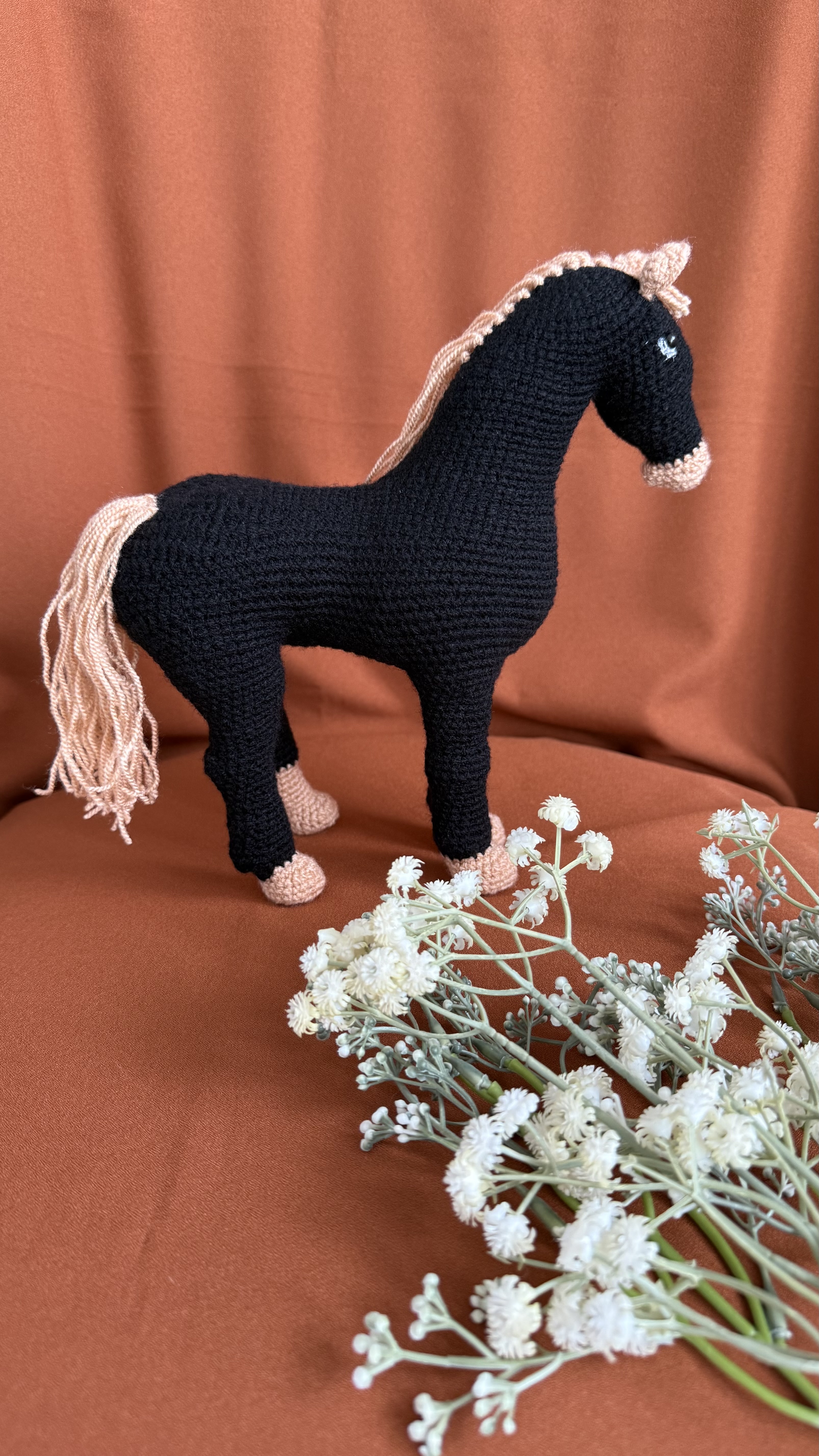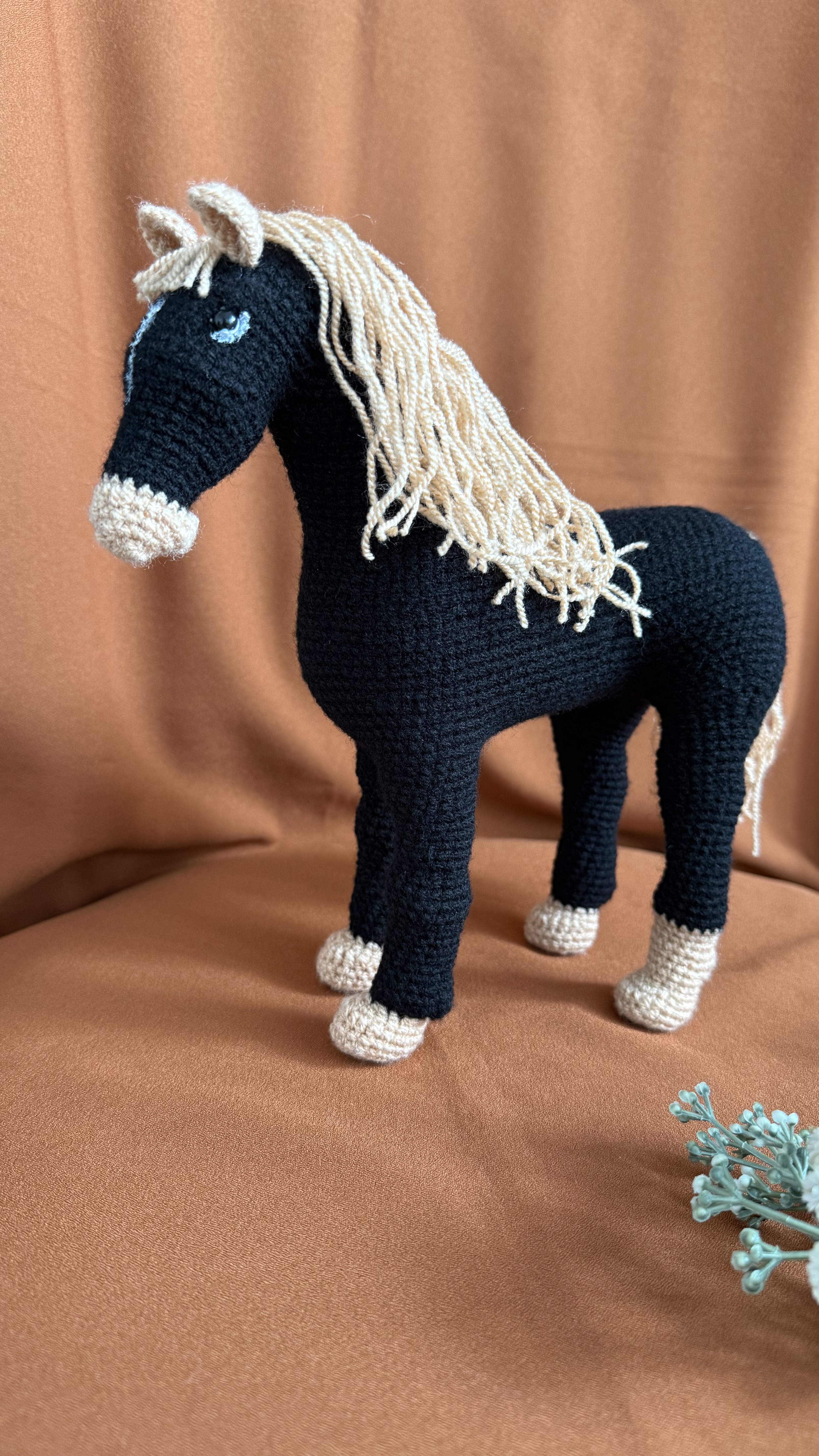 عروسک بافتنی اسب وحشی سیاه مو طلایی یکی از جدید ترین عروسک های بافتنی تیم وانیا می باشد که در آن از تکنیک رنگامیزی نیز استفاده شده است .