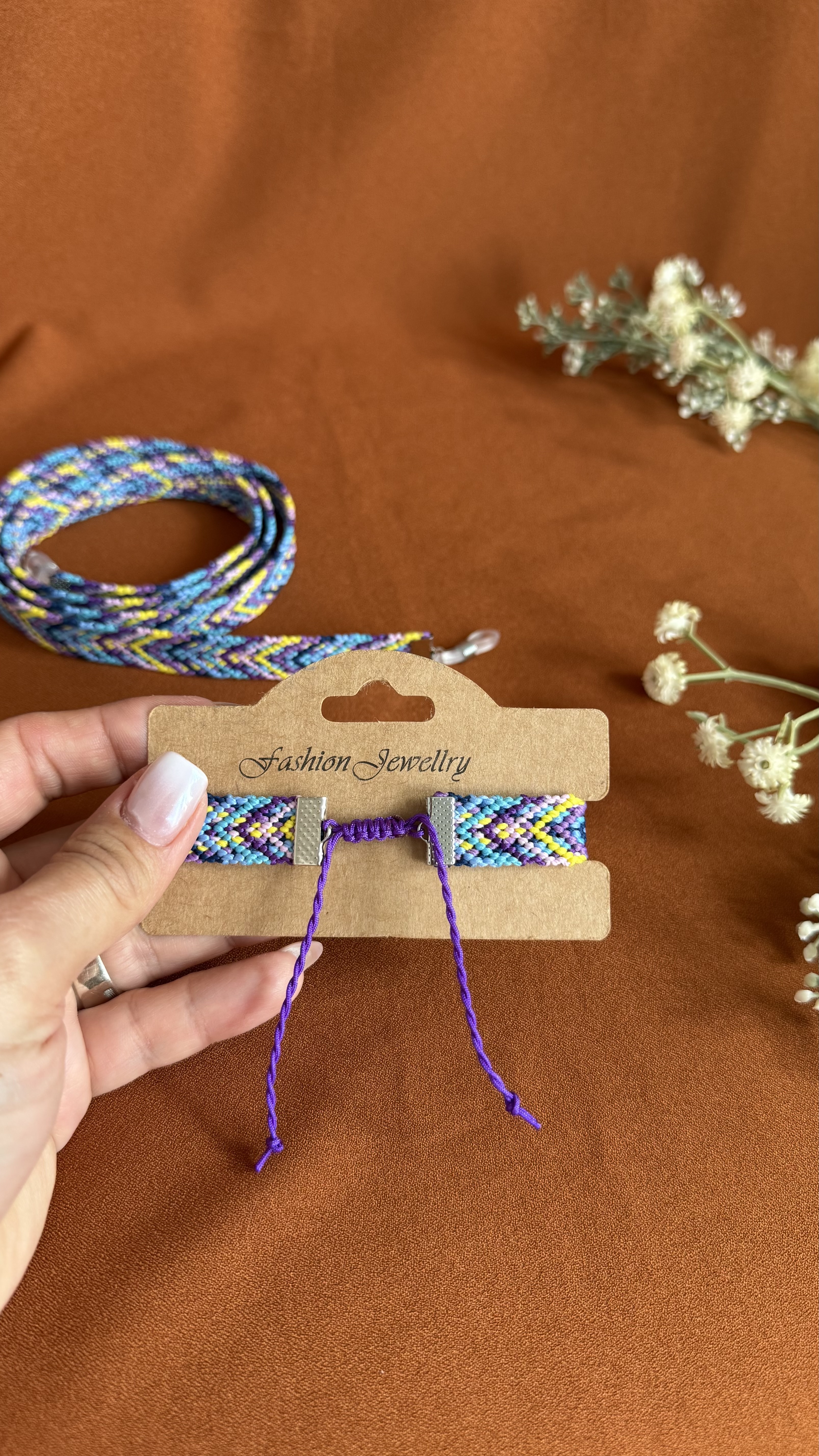 در بافت این ست دستبند و بندعینک از رنگ های شاد و متنوع استفاده شده است در نتیجه میتوان آن را با لباس های مختلف استایل کرد .