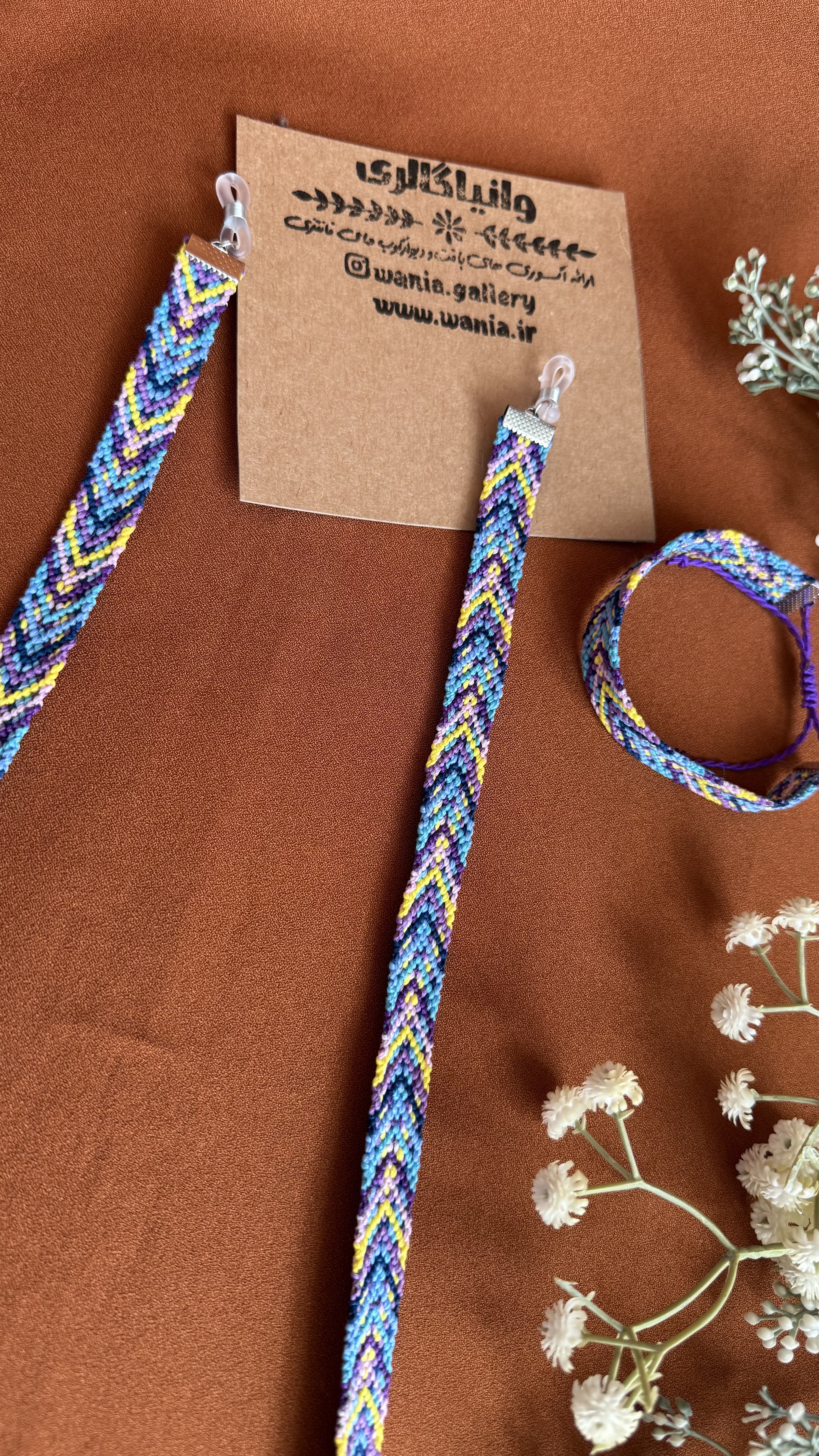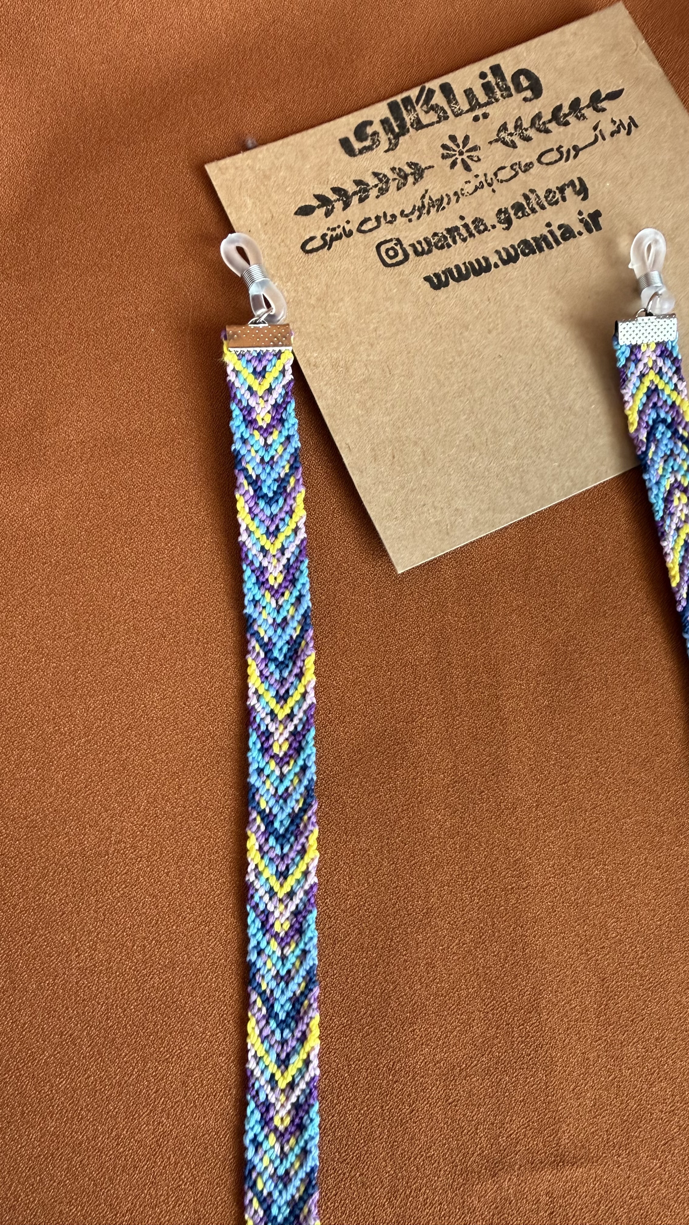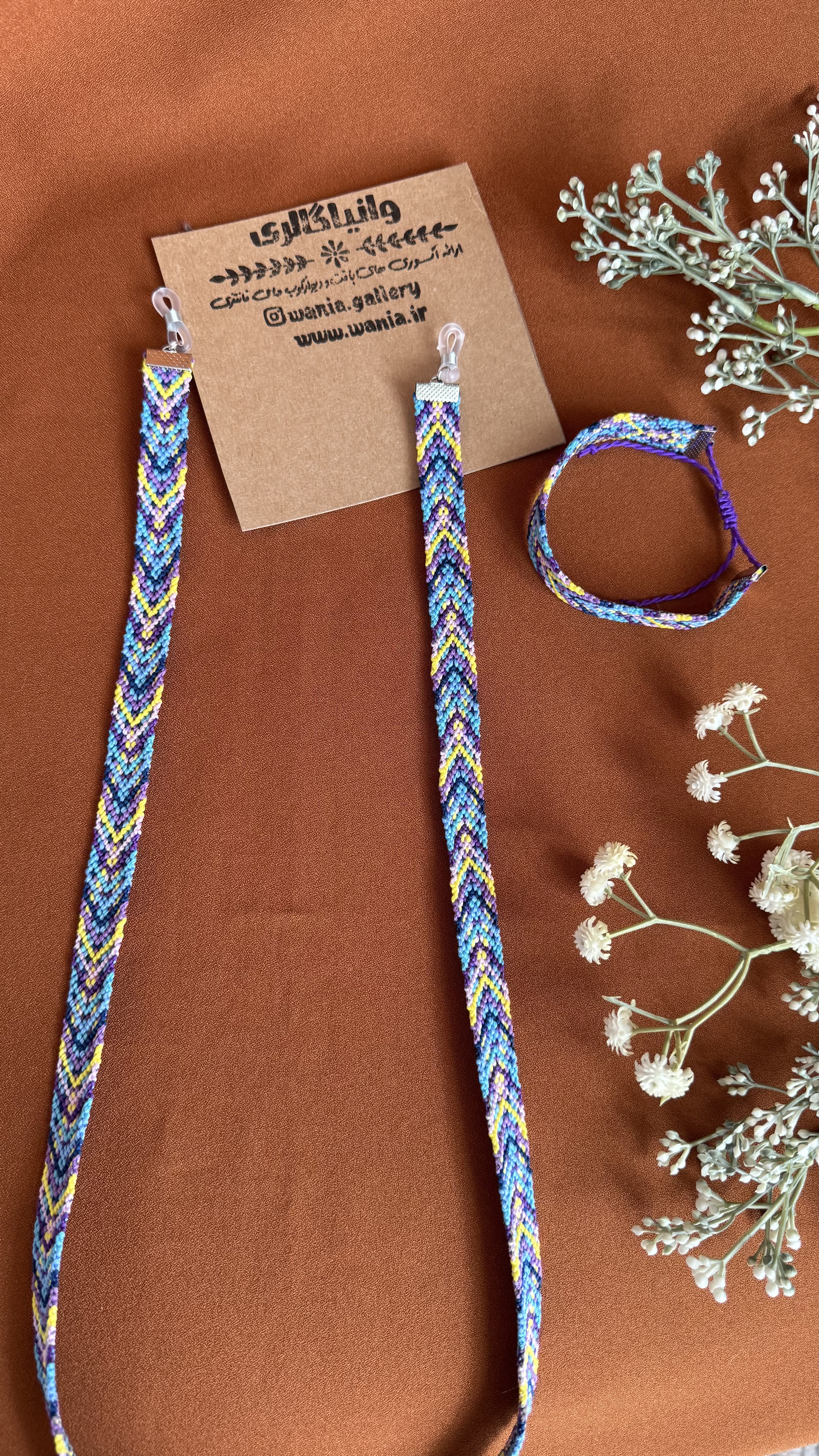 ست هدیه بندعینک و دستبند دستبافت طرح موج یکی از جدیدترین کارهای تیم وانیا می باشد که با صرف وقت زیاد و همچنین با حساسیت زیاد در مورد انتخاب رنگ نخ ها بافته شده است .