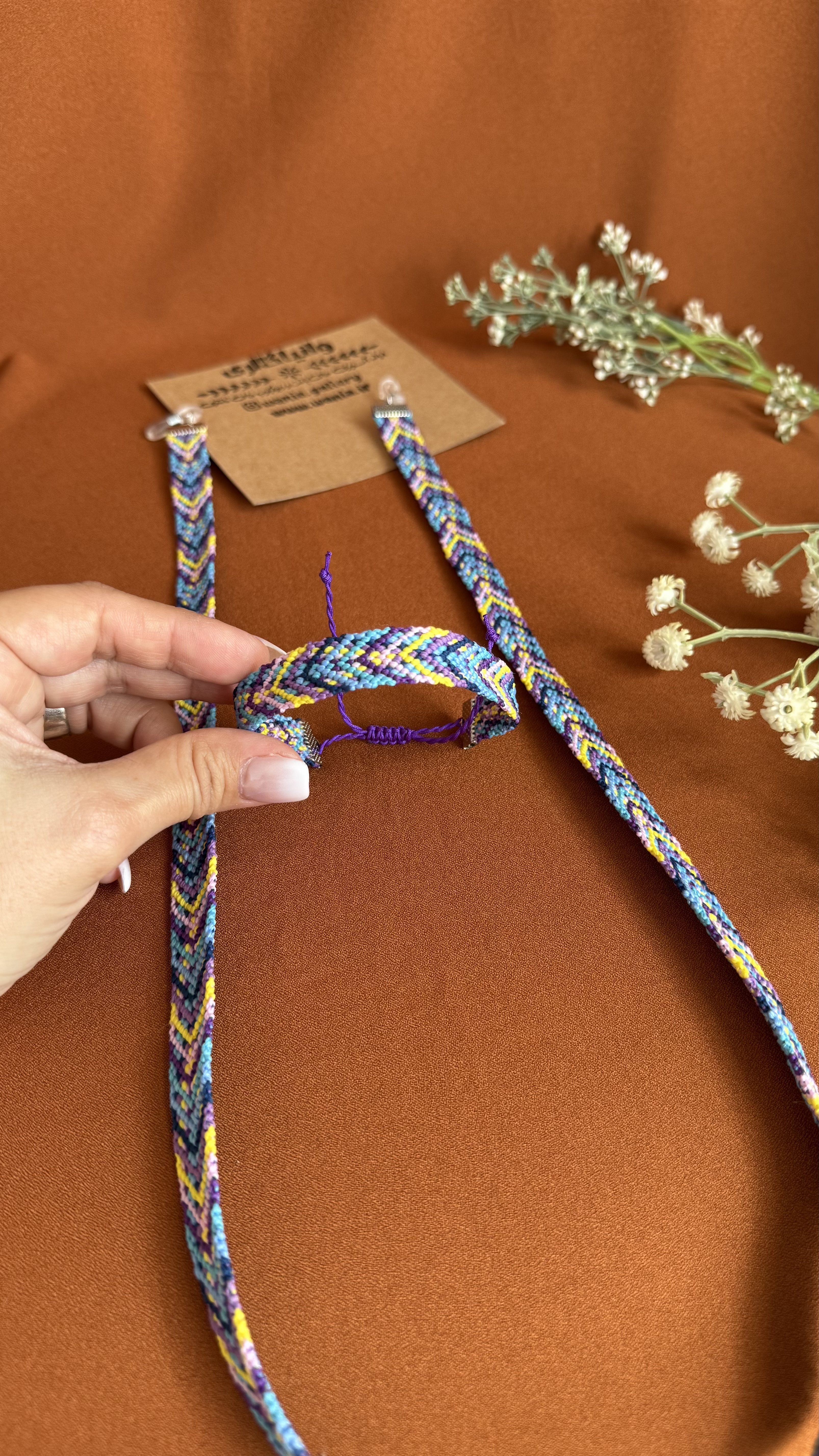 همچنین پشت دستبند گره کشویی بافته شده است و میتوان دستبند را به آسانی روی دست پوشید و میتوان سایز و طول آن را متناسب با مچ دست تنظیم کرد .